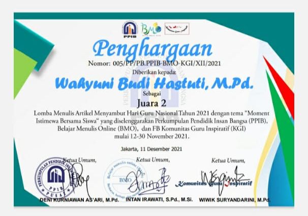 Satu torehan prestasi kembali diukir oleh dua tenaga pendidik MTsN 34 Jakarta, yaitu ibu Wahyuni Budi Hastuti, M.Pd (Juara ke-2) dan ibu Dwi Ning Wahyuni Budi, S.Pd, M.Sc (Juara Harapan ke-2) yang telah memenangkan lomba menulis artikel menyambut Hari Guru Nasional tahun 2021.
