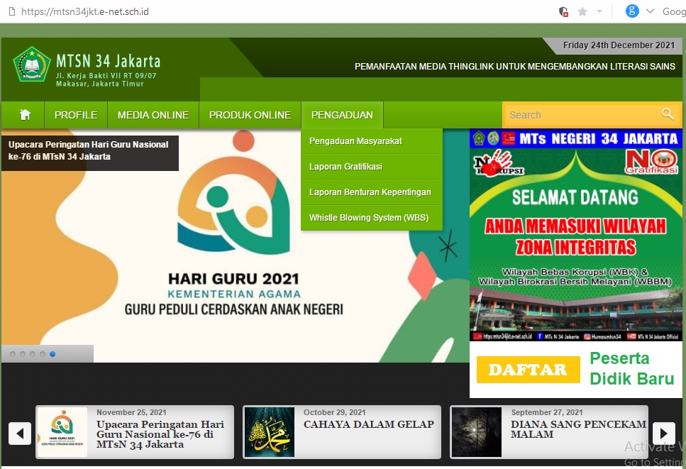 Berdasarkan Keputusan Menteri Agama Republik Indonesia No.765 Tahun 2019 Tentang Pedoman Pengelolaan Pengaduan Masyarakat dan Whistleblowing Pada Kementerian Agama dan Keputusan Inspektur Jenderal Nomor 17 Tahun 2020 tentang Tim Pengelola Pengaduan Masyarakat dan Whistleblowing Inspektorat Jenderal Kementerian Agama, maka guna meningkatkan Zona Integritas dengan WILAYAH BEBAS KORUPSI (WBK) DAN WILAYAH BIROKRASI BERSIH MELAYANI (WBBM), MTs Negeri 34 Jakarta membuka layanan pengaduan masyarakat melalui websitenya di https://mtsn34.sch.id/.