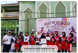 Tim Bola Basket MTS Negeri 34 Jakarta Timur membuktikan masih menjadi yang terbaik, yang itunjukkan dengan meraih juara 3 pada Kejuaraan Basket Spiritof champion yang diadakan di SMK Budhi Warman pada tanggal 21 s/d 25 Februari 2024. Tim yang ditangani coach Domo itu mengalahkan SMP Negeri 126 jakarta dengan skor 13-11. Wakil Sarana dan Prasarana sekaligus Pembina Ekskul Basket Bapak Mustopa Sidikh,M.Pd mengapresiasi hasil yang diraih tim basket putri MTs Negeri 34 Jakarta Timur. ”Kami bangga atas hasil yang diraih para siswi menjadi juara 3 pada event kali ini,”katanya. Menurutnya, hasil bagus itu diraih berkat tim yang solid, Kami berharap, hasil ini tidak membuat puas diri, karena masih banyak kejuaraan yang akan diikuti lagi,” ujarnya. Dia minta para pemain tetap giat berlatih keras untuk memperbaiki kekurangan fisik dan tekniknya. ”Kami akan selalu mendukung tim Basket MTs Negeri 34 Jakarta Timur untuk mengukir prestasi mengharumkan nama madrasah,” ungkapnya. Sementara itu, Pelatih Basket USM, Coach Domo mengatakan, pihaknya bersyukur para pemain mampu menjalankan instruksinya sehingga permainan cukup solid. ”Anak-anak mampu menjalankan taktik dan strategi yang kami terapkan. Mereka bermain cukup apik dan kerja sama yang solid di lapangan, sehingga bisa meraih juara,” tandasnya