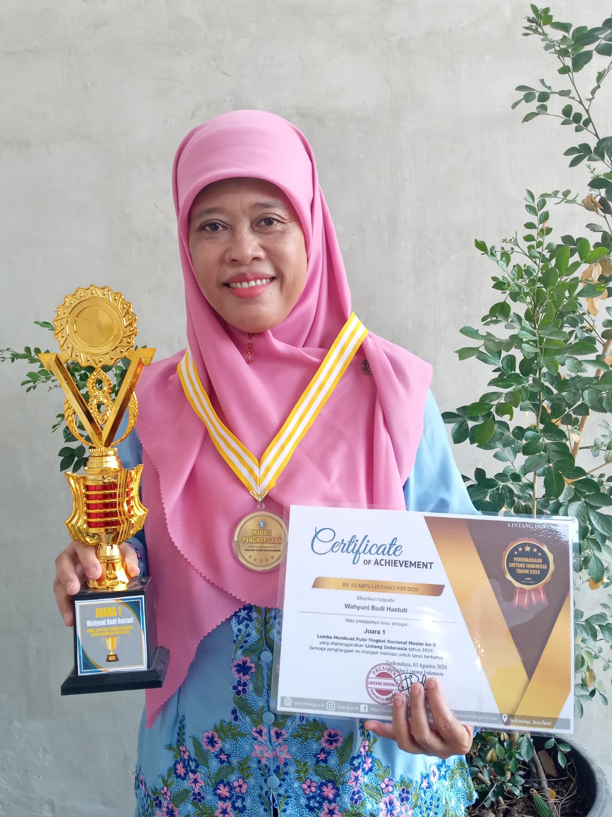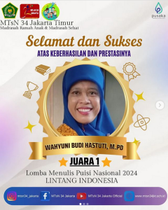 (Humas MTsN 34) Alhamdulillah, Juara 1 diperoleh ibu Wahyuni Budi Hastuti, M.Pd dalam lomba menulis puisi nasional 2024 lintang Indonesia secara online pada hari Sabtu, 3 Agustus 2024.