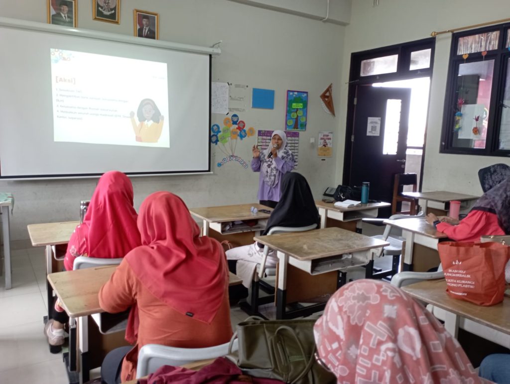 Kegiatan dilanjutkan dengan berbagi praktik baik dari bapak dan ibu guru. Seluruh peserta dikelompokkan dalam 4 kelas berbagi. Yunti berbagi praktik baiknya kepada bapak dan ibu guru di kls D. Judul yang diangkat adalah ” misiku ZWS di MTsN 34 Jakarta”.